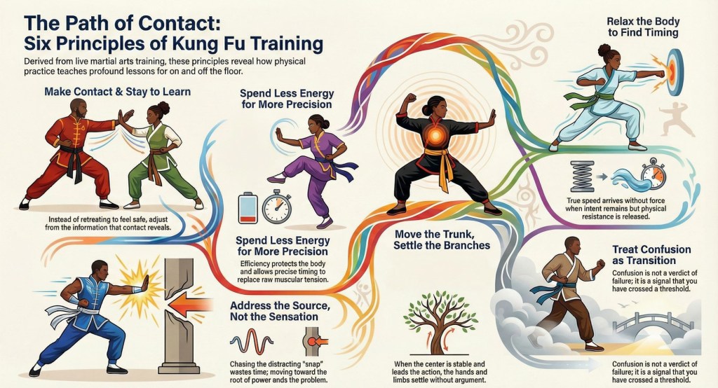 So I keep the practice concrete and repeatable, the way martial knowledge prefers it. I make contact and stay in range long enough to learn, spend less energy so precision can show itself, address the source instead of chasing sensation, move the trunk so the branches settle without argument, treat confusion as a signal of transition rather than a verdict, and relax the body so timing can arrive without force—principles that don’t ask for belief but ask for repetition.