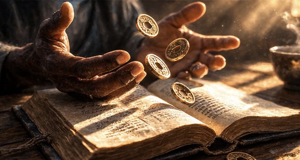 I held the book in my hands, feeling its lived weight, meeting the softened corners, seeing pencil notes tucked into the margins like footprints in dried mud, and noticing a date that carried its own quiet weather—August 18th, 2019—reminding me that time keeps moving, seasons keep turning, and yet the page keeps offering itself, unchanged in availability, unbothered by my delays. Coins waited in my palm, clicking lightly as I shifted them, metal meeting skin, intention meeting chance, and then I cast, letting the small clatter settle into stillness.