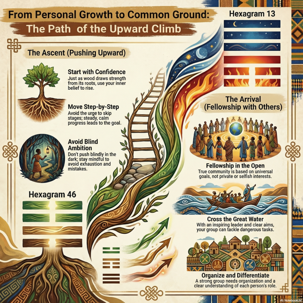 And then the sixth changing line closes with restraint, touching the shoulder just before the body lunges: disengage ego and ambition; do not hurl yourself at a closed door; guard inner independence as your most valuable asset. That counsel lands cleanly for me, because a closed door does not always demand courage; sometimes it demands discernment, sometimes it asks for a pivot, sometimes it protects energy, sometimes it points toward a different corridor entirely. A tree does not punch a boulder. It bends, it builds, it continues.